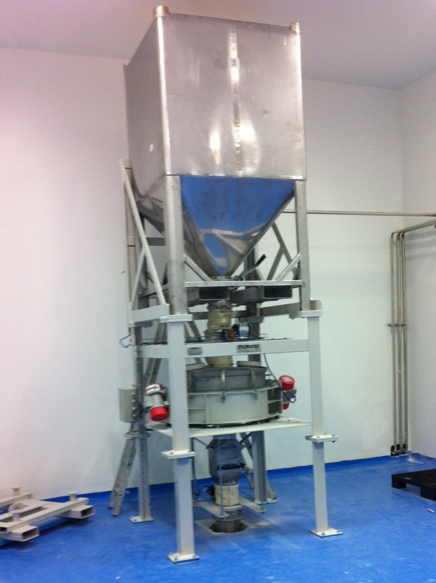 O Descarregador de Bins foi desenvolvido para auxiliar no processo de descarregamento de bins, contendo produtos em pó, para a alimentação da envasadora de produtos em pó em embalagem do tipo lata ou sache. Pode ser, opcionalmente, fornecido com: